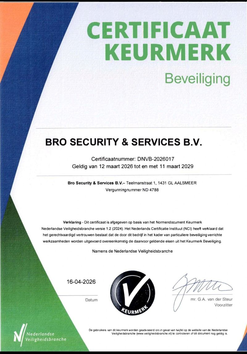 Officieel gecertificeerd: Bro Security & Services B.V. behaalt het Keurmerk Beveiliging!
